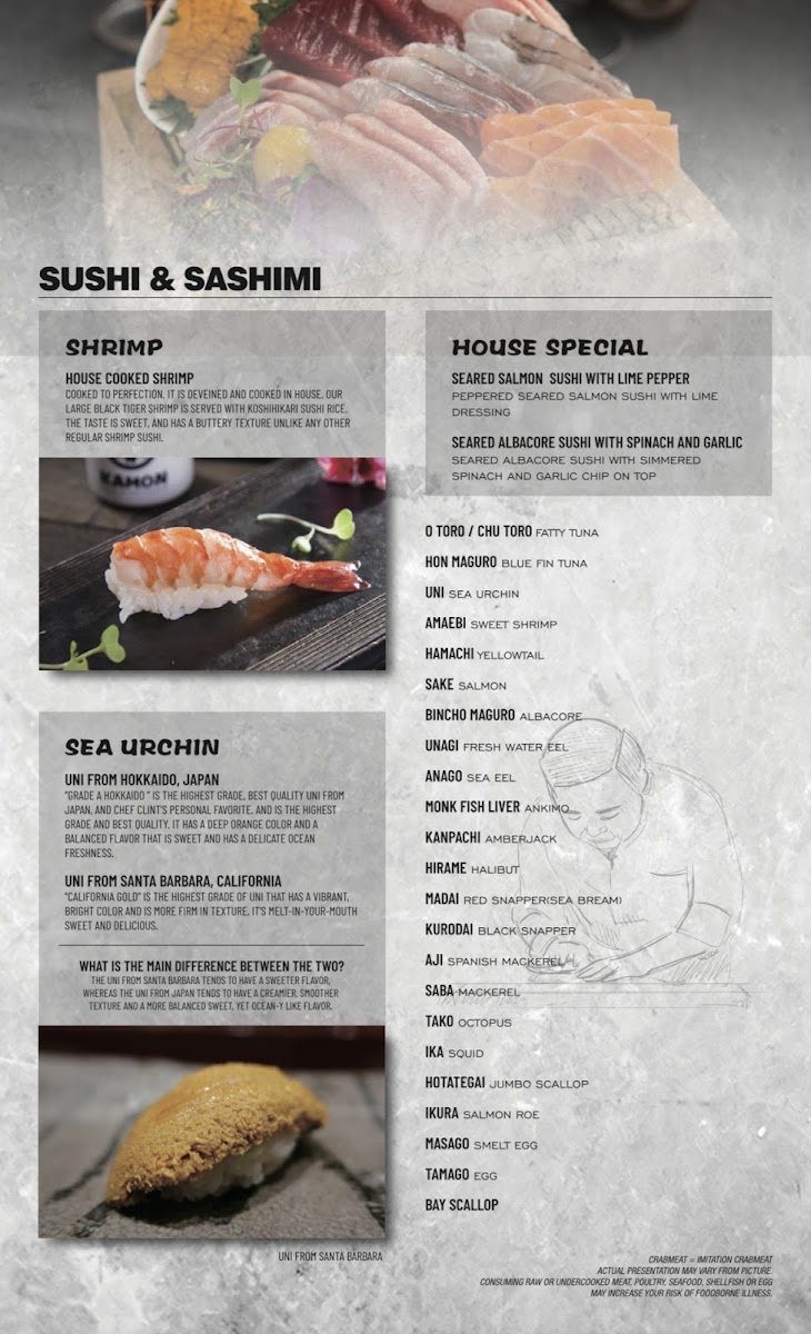 FATTY TUNA(TORO), BLUEFIN TUNA, SEA URCHIN(UNI), YELLOWTAIL, SALMON, ALBACORE, RED SNAPPER, BLACK SNAPPER, SWEET SHRIMP, HOUSE COOKED TAMAGOYAKI, AND FRESH WASABI